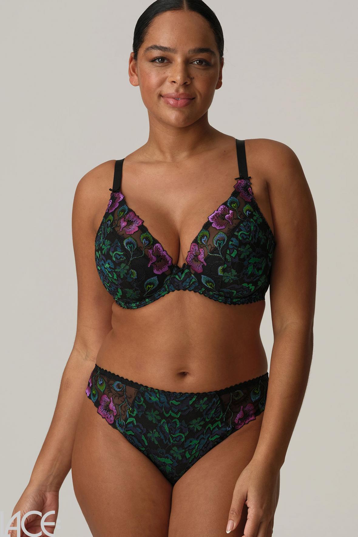 PrimaDonna San Angel combines feminine lace with exotic floral embroidery. Peacock Feather is a blend of vivid colors. Warm fuchsia and intense shades of blue and green create a stunning contrast against a black background.